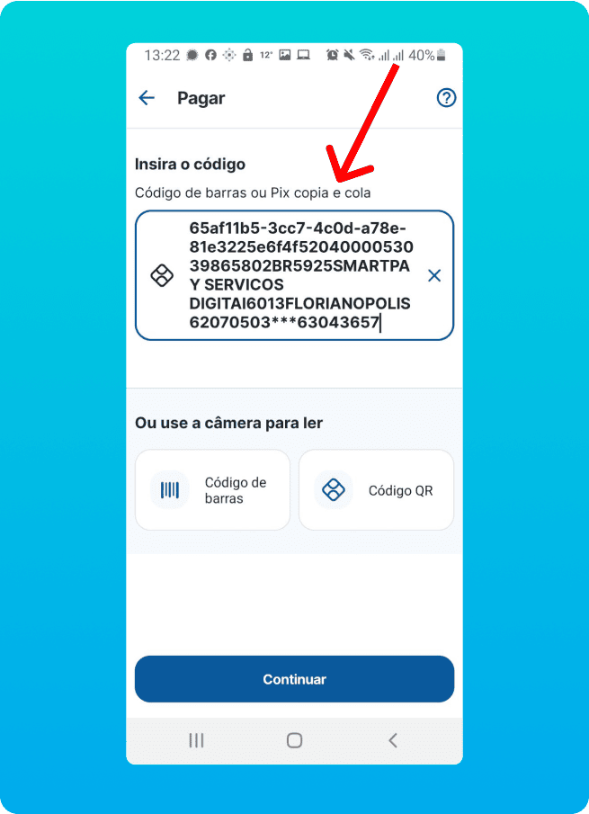 Cole o "Código PIX" e clique em "Continuar" para realizar o pagamento.